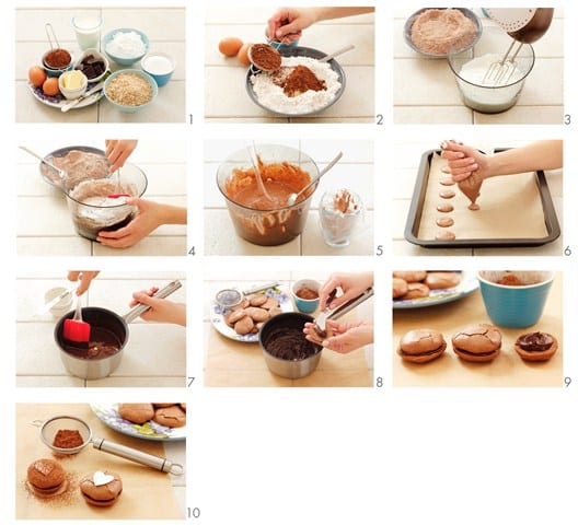Pair macarons of similar size. Remove the ganache from the refrigerator. Scoop the ganache to about the size of a cherry (about 1 teaspoon) onto the centre of a macaron half. Top with another half and press gently so that it looks like a mini hamburger.. Refrigerate, covered, at least 24 hours before serving.