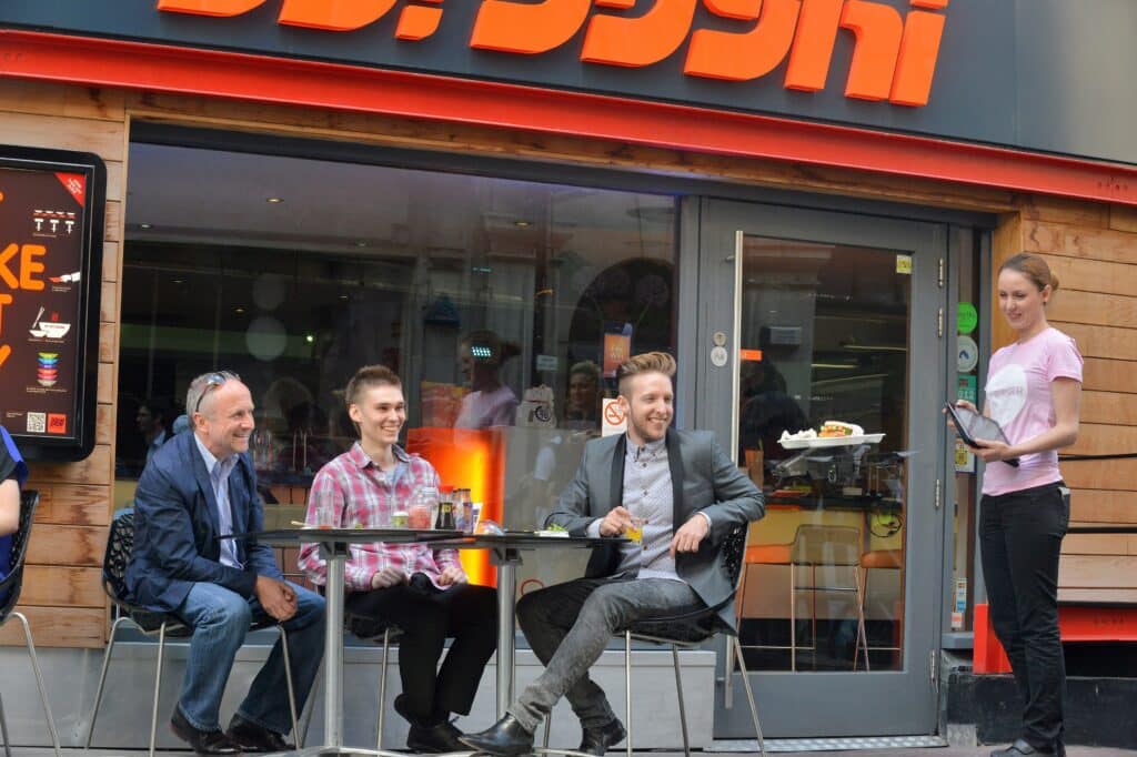 Egy brit étterem jelentősen megnövelte az ételkiszállítás sebességét a vendégek asztalához – a világ első repülő tálcájával. A pincérek most akár 25 mérföld per órás sebességgel repíthetik az iTray-t az asztalok fölött és a székek között – avagy hatszor gyorsabban, mint a pincérek átlag sebessége. A japán Yo!Sushi étteremlánc központi londoni éttermének személyzete jelenleg most kísérletezget a gépezettel. A pincérek és pincérnők egy iPad segítségével irányítják a repülő tálcát, míg a konyhai személyzet egy két helyszíni kamera által vett élő video felvételről tudja ellenőrizni, hogy az étel ki lett-e szállítva. A személyzet megpakolja tálcát, elrepítik a vendég asztalához, akár 50 yard-nyi távolságba is, és visszarepítik, amikor látják, hogy az ételt leszedték róla. Egy pincérnő, Gabriella Micu, 28, azt mondta: „Ez igencsak mókás a vendégek számára és reméljük, hogy elérkezünk majd ahhoz a ponthoz, amikor a központi konyhából tudjuk kiszolgálni a vendégeket, mivel egyértelműen csökkentené a mászkálással töltött időt az étteremben.” A cég az iTray bevetésével új hamburgerük forgalomba hozatalát kívánja fémjelezni, amelynél hagyományos hamburger bucijukat japán pirított rizsre cserélték le. Egy vendég, Mark Love, 26, Londonból azt mondta: „Amikor megrendeltem a hamburgert, még csak nem is képzeltem volna, hogy egy tálcán fog odarepülni hozzám. Elképesztő volt és a legfurcsább dolog, amit valaha láttam, mintha egy tudományos fantasztikus regényből lépett volna elő. Varázslattal szállították, akár egy földönkívüli repülő csészealj, egyenesen az asztalomhoz repítve az ételt.”