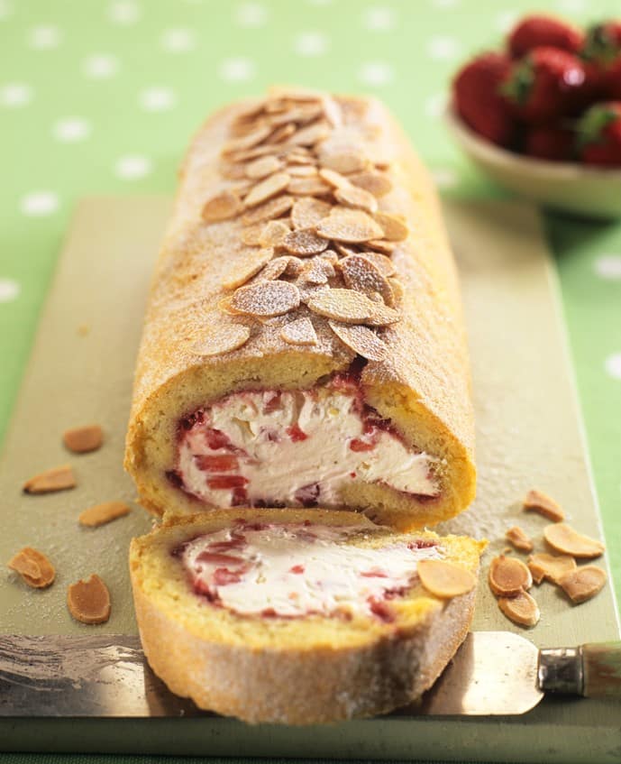 7)      Carefully roll up the roulade from the short end, using the paper to help. Don’t worry if it splits. Place on a serving plate. Sprinkle with a little more caster sugar, put the flaked almonds down the center of the roulade and dust with icing sugar or caster sugar.