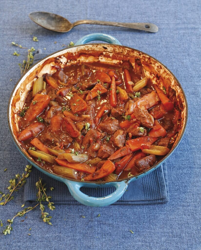 4. Return the beef to the pan, and any juices that have come out of it, and sprinkle over the flour. Stir well, then pour in the red wine and bring to the boil. Reduce the heat and simmer until the wine has almost evaporated. Add the can of tomatoes to the pan and add the stock cube, bay leaves and a couple of spring of thyme, then bring the mixture to the boil. Cover the casserole dish with a lid or, if using a sauté pan, tip the mixture into a covered ovenproof dish. Cook in the centre of the oven for 1½ -2 hours, or until the beef is really tender.