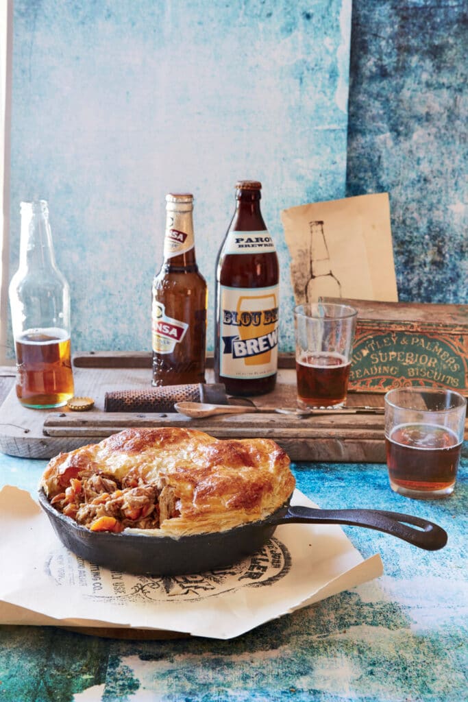 3. Add the vegetables and cook for a few minutes, stirring. Add the beer. Bring to the boil. Remove from the heat and cover. Transfer to the preheated oven and cook for three hours or until the meat is falling apart.