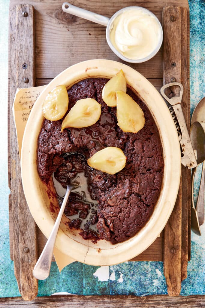 3. Drizzle the molasses all over the top of the pudding and then carefully pour the boiling water over the pudding. Bake in a preheated oven for 45 minutes or until the pudding has set.