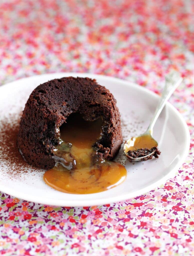 3. Whisk the eggs, additional egg yolks and sugar together until the mixture is light and fluffy. Fold in the melted chocolate mixture. Sift the flour over the top and stir it in. Fill each tin to two-thirds full with the resulting mixture. Place a spoonful of the caramel sauce in the centre of each pudding, then top with the remaining mixture.