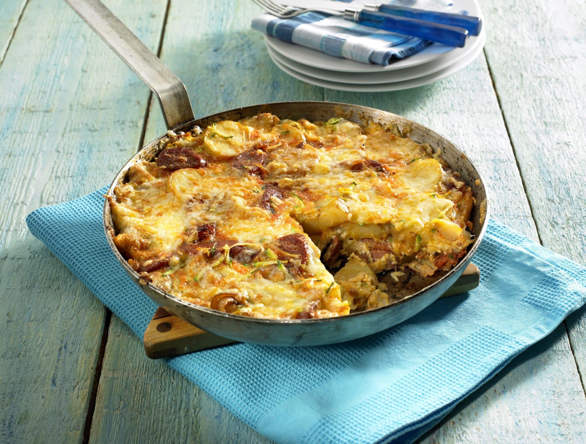 A meal in a pan – a traditional Spanish-style omelette filled with Manchego cheese and spicy chorizo.