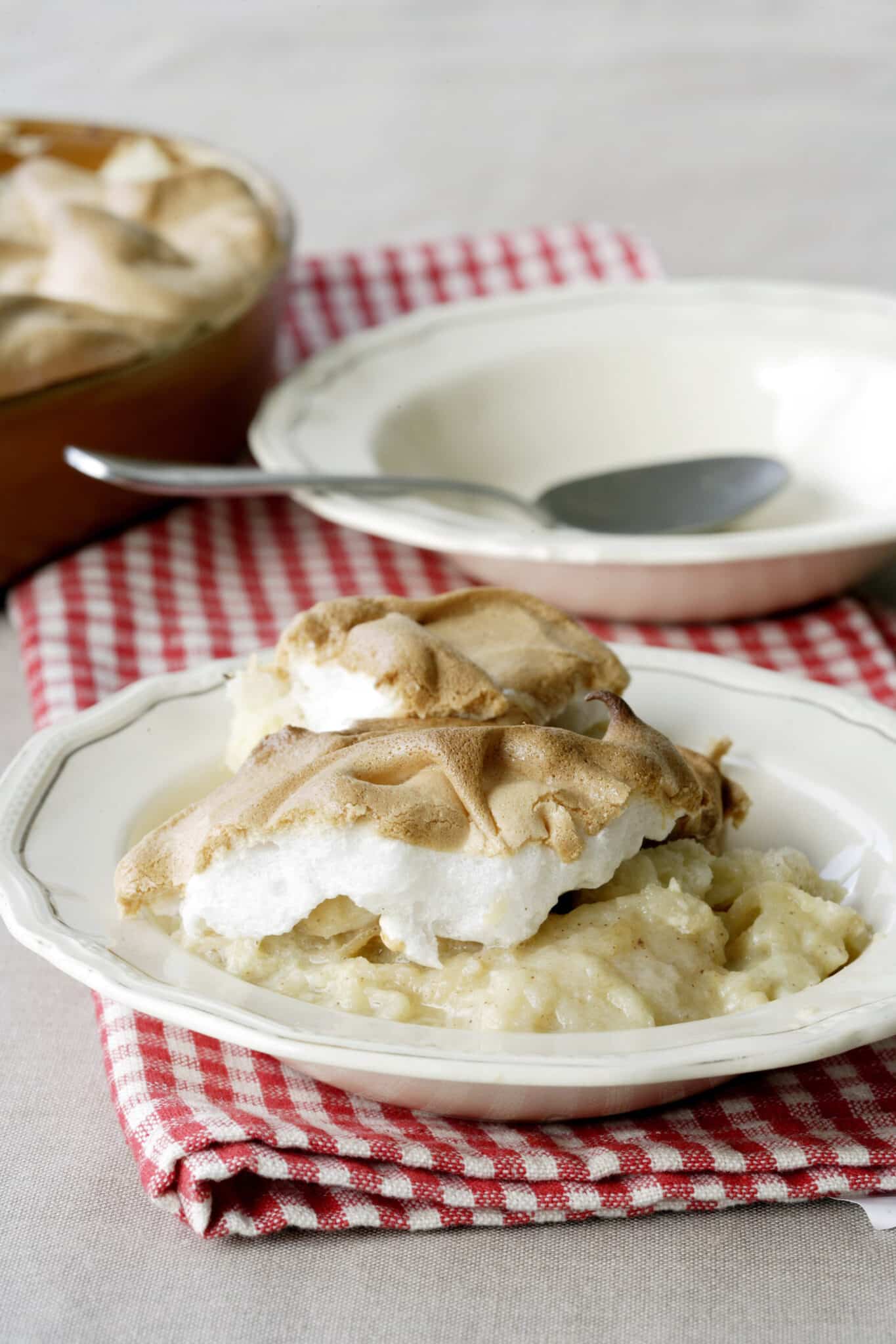 5. Remove the bread pudding from the oven and place the egg white mixture on top. Return to the oven for 25 – 30 minutes until it is golden brown.