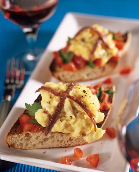 3. Beat the eggs and milk together in a bowl. Melt the butter in a small pan, add the eggs and cook over a medium heat, stirring occasionally to scramble them. Drizzle the toast with the rest of the oil. Spoon some tomato salad over and them some scrambled egg. Arrange strips of anchovy fillets on top and sprinkle with ground black pepper. Serve with rocket salad or other leaves, if you like. Not suitable for freezing.