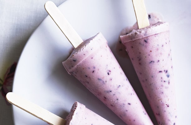 1. Place the ingredients in a liquidiser or food processor and whizz until smooth. Pour the mixture into the ice-lolly moulds and freeze for about 2 hours, until the mixture thickens. Press a stick into each and leave in the freezer and freeze until solid.