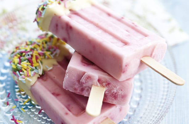 2. Mix in low-fat natural yogurt. Pour into 6 or 8 ice-lolly moulds and freeze. Once frozen, take them out of the moulds and dip tips of the lollies in melted white chocolate, then quickly dip them in sugar balls or strands. Serve as soon as they set!