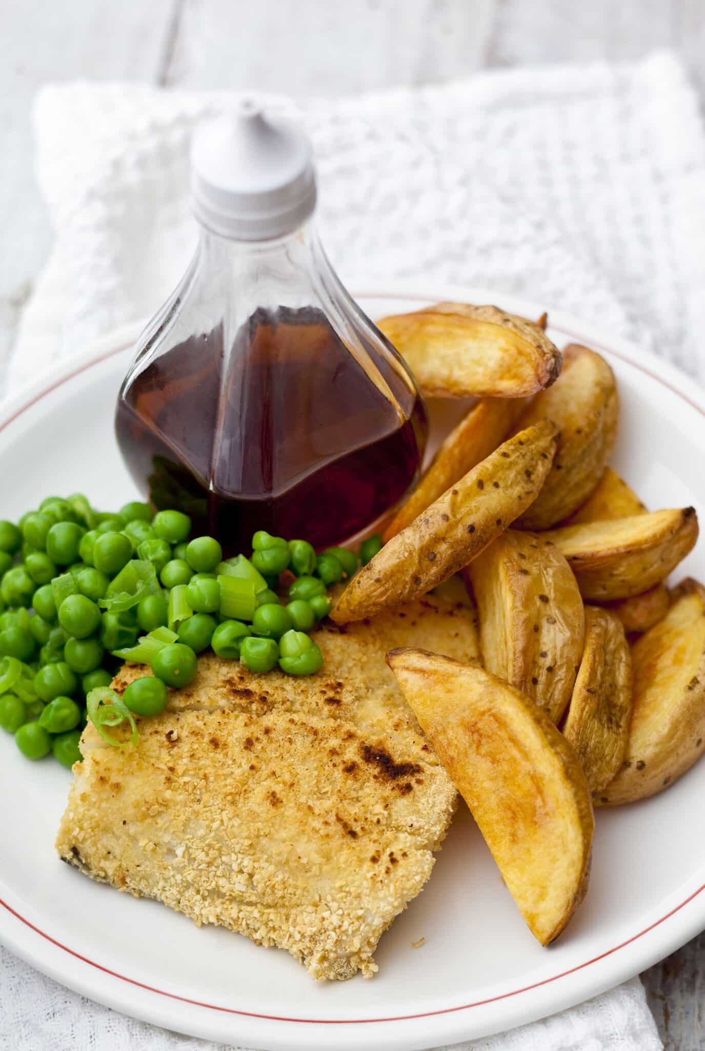 Set oven to 22°C or Gas Mark 7. Cut 2 potatoes into wedges and coat in 2 tsp oil. Roast on a baking tray for 30 mins. Dust 2 pieces of haddock or cod in 2 tsp seasoned flour, dip in beaten egg, and coat in 2 tbsp toasted matzo meal. Turn the chips, put the fish on the same tray and cook for 10-12 mins. Serve with peas.
