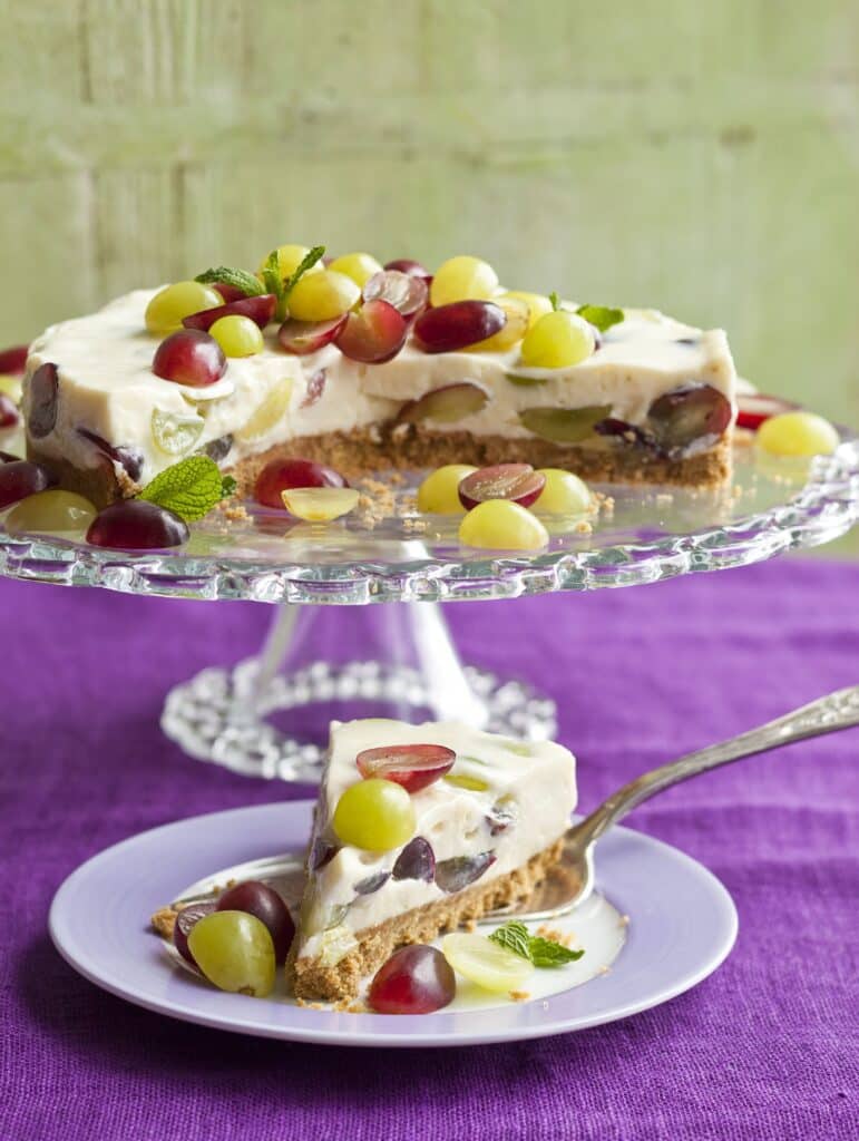 3. Spoon about half the mixture over the base and then scatter over the grapes. Spoon the rest of the mixture over the top and level the surface. Chill the cheesecake in the fridge for a few hours, or overnight, until it’s set.