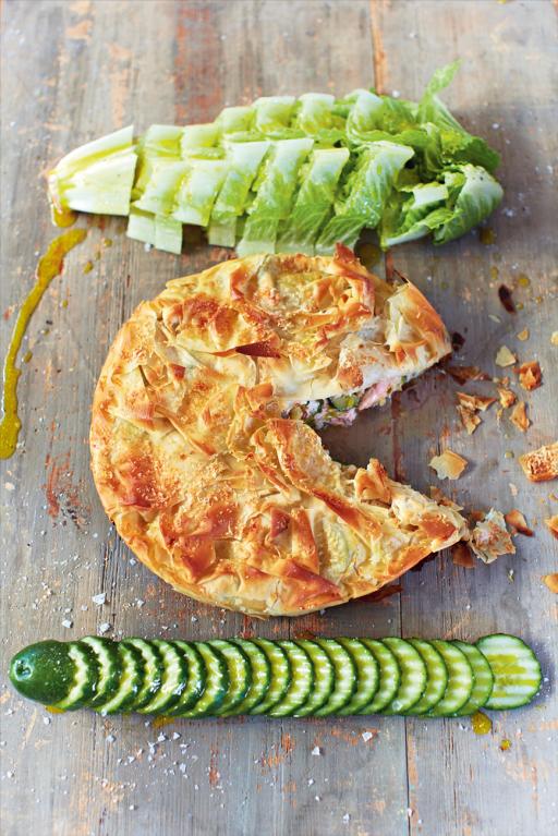 Meanwhile, slice the lettuce and cucumber. Mix the juice from the lemon, the extra virgin olive oil and a pinch of salt and pepper together, then drizzle over the salad veg. Transfer the filo pie to a board, cut into wedges, and serve.