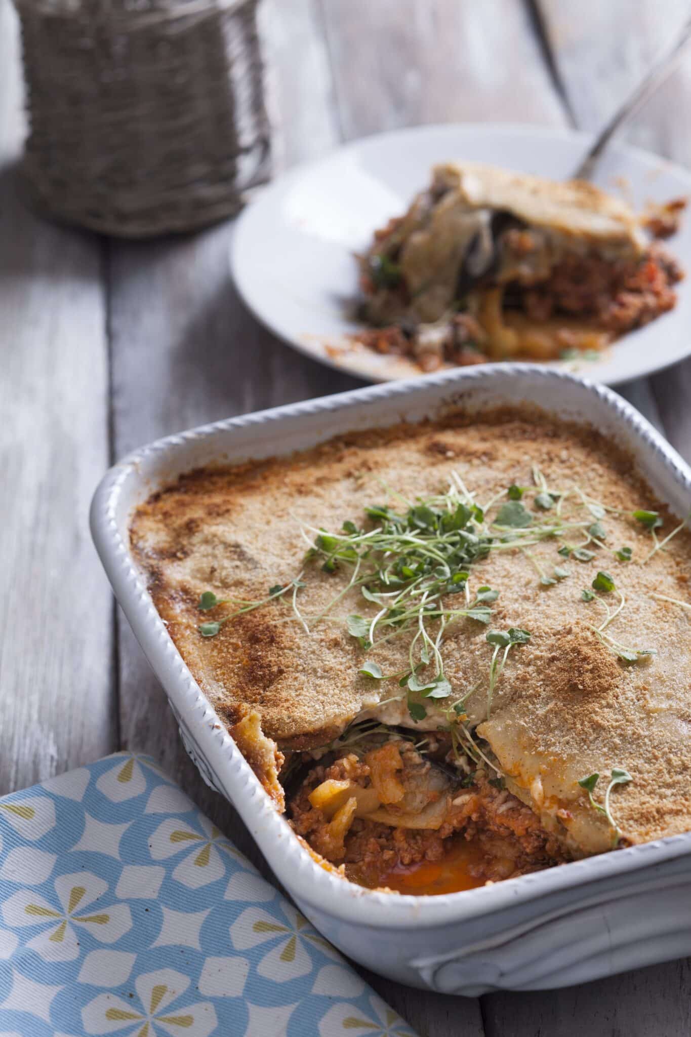 For the sauce, heat the milk, thyme, rosemary, bay leaf and onion in a small saucepan until warm but not boiling. Remove from the heat and set aside to infuse for 20 minutes. Strain, discarding the solids. Melt the butter in a pot and stir in the flour to make a paste. Slowly add the infused milk, stirring continuously until smooth and thick. Season with salt, pepper and nutmeg and set aside. Heat the oil in a large pan and fry the onion and garlic for a minute. Add the mince and brown for 2-3 minutes on high. Stir in the wine, tomatoes and parsley and season. Simmer for about 20 minutes. Preheat the oven to 180°C. Arrange the fried potato rounds in a baking dish and season. Spoon over the mince mixture and cover with a layer of aubergines. Pour over the béchamel sauce and sprinkle with breadcrumbs. Bake for 30-40 minutes.