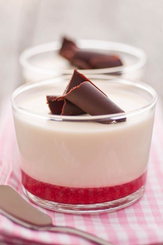 7. Spoon panna cotta mixture, evenly dividing between dessert cups, over top raspberry jelly layer. Refrigerate to set panna cotta for 2 to 4 hours.