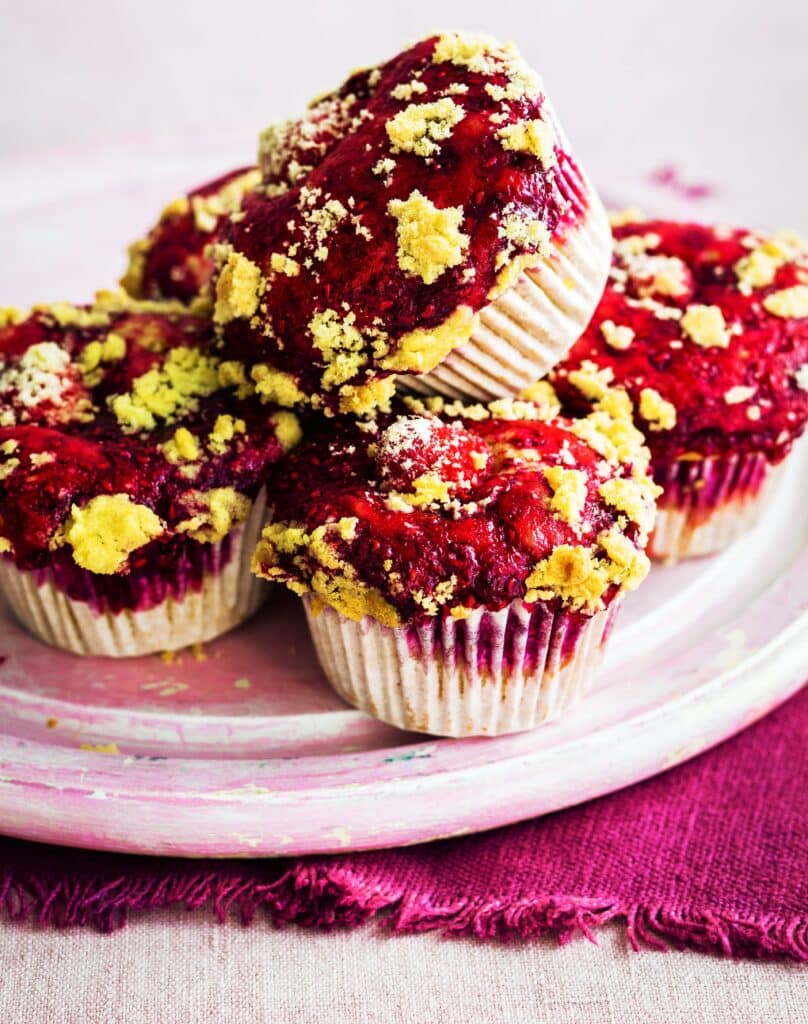 5. Use an ice-cream scoop to divide the muffin mixture between the paper cases. Top each with a spoonful of the raspberry. Sprinkle over the crumble. Bake for 25 mins until well risen and a cocktail stick inserted in the centre comes out clean.