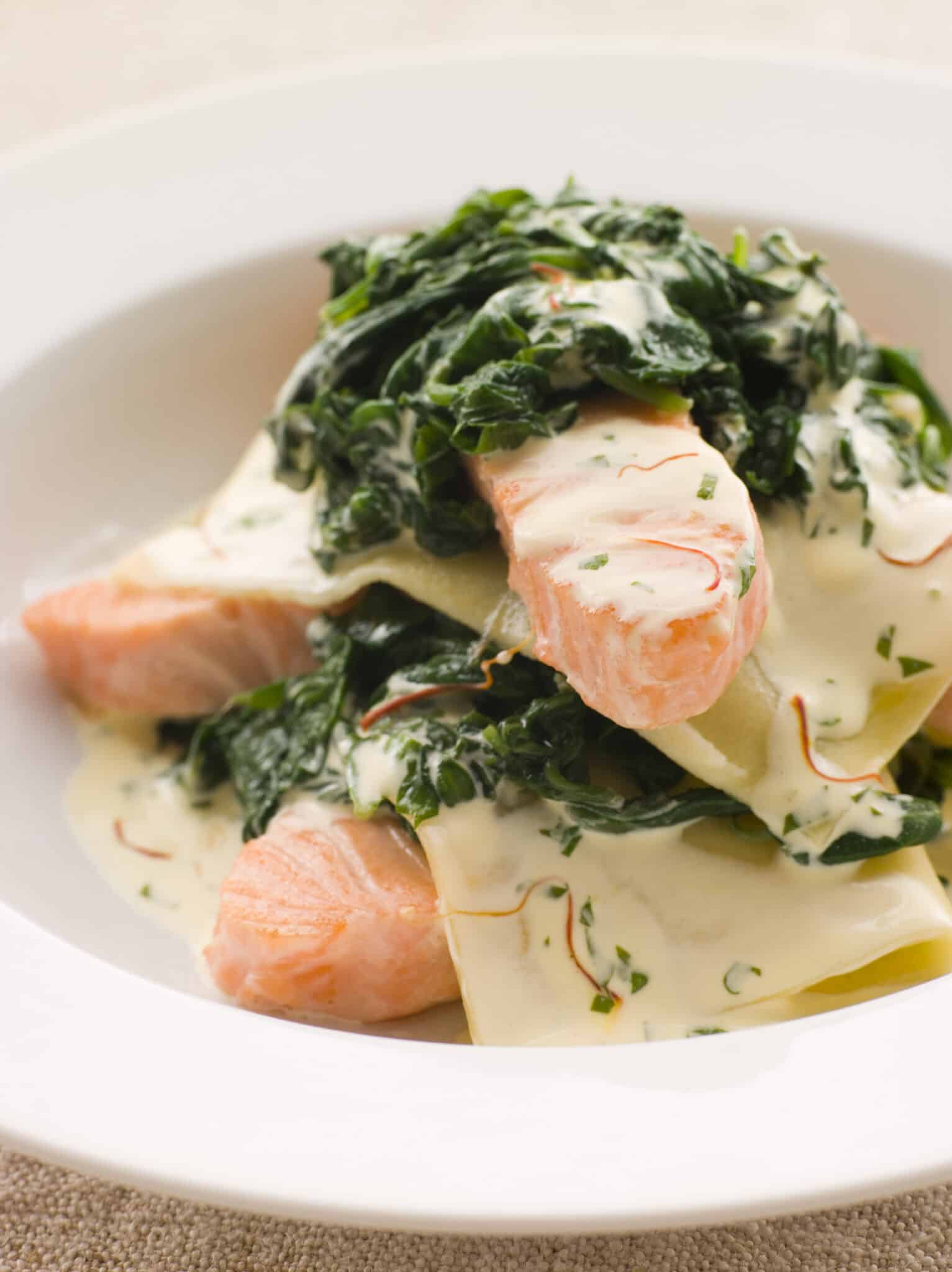 2. Boil water for the lasagne pasta while the salmon is being prepared. Throw the fresh or thawed spinach in a pot with the heavy cream, nutmeg, sugar, salt and pepper. Stir the corn starch with a teaspoon of water and add to the spinach when boiling to thicken slightly. Cook for at least a couple of minutes or more.