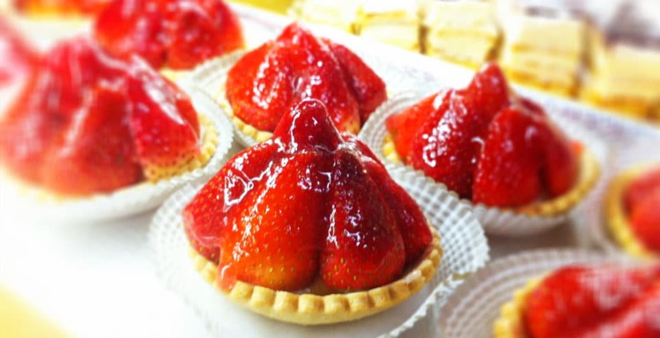 Wash the strawberries, remove the stalks and chop in half. Place them onto the crème patissière. Garnish with fresh mint and a dusting of icing sugar.