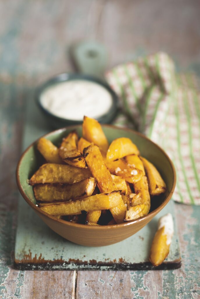 3. Pour the oil over the swede in the roasting tin and sprinkle the sea salt over. Roast for 20 mins, turn the chips and cook for further 15 mins until they’re tender to golden.