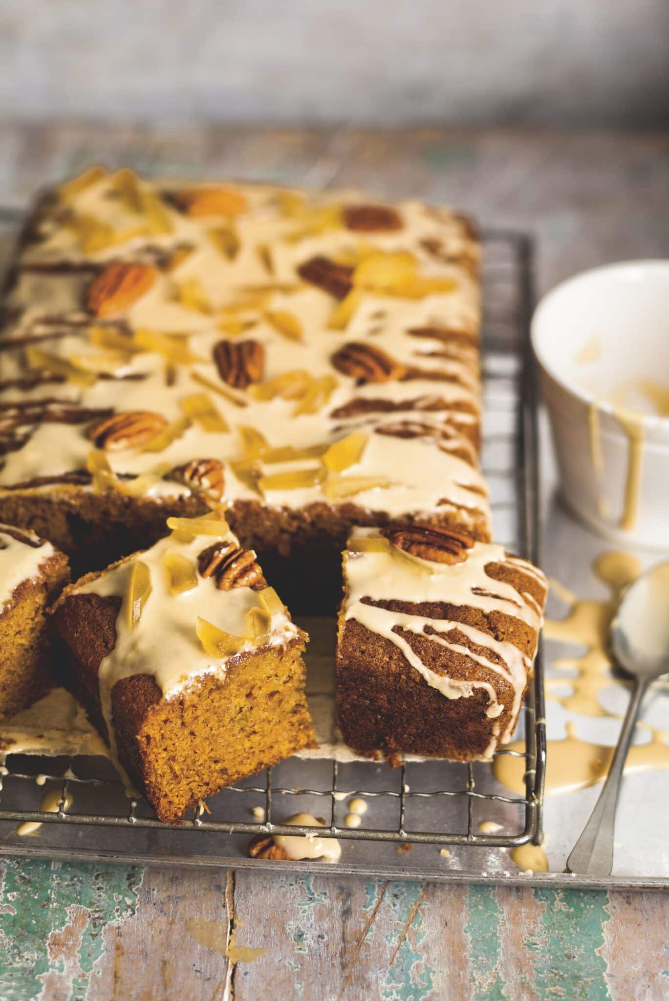 6. Upturn the sweet potato cake on to a wire rack and drizzle over the icing. Scatter over the pecans and ginger pieces. Cut into squares to serve.