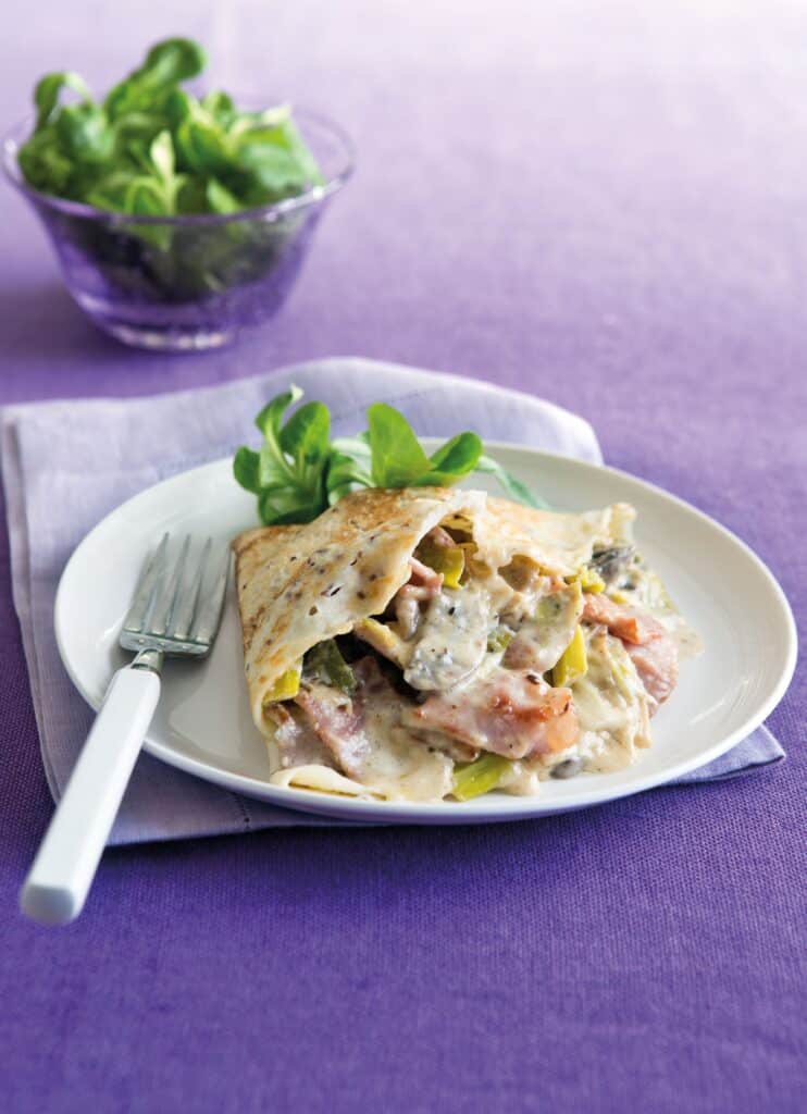 3. Place a hot pancake on a plate and spoon on a quarter of the bacon and leek mixture, then fold the pancakes into quarters. Fill the other pancake in the same way, then serve immediately with salad.
