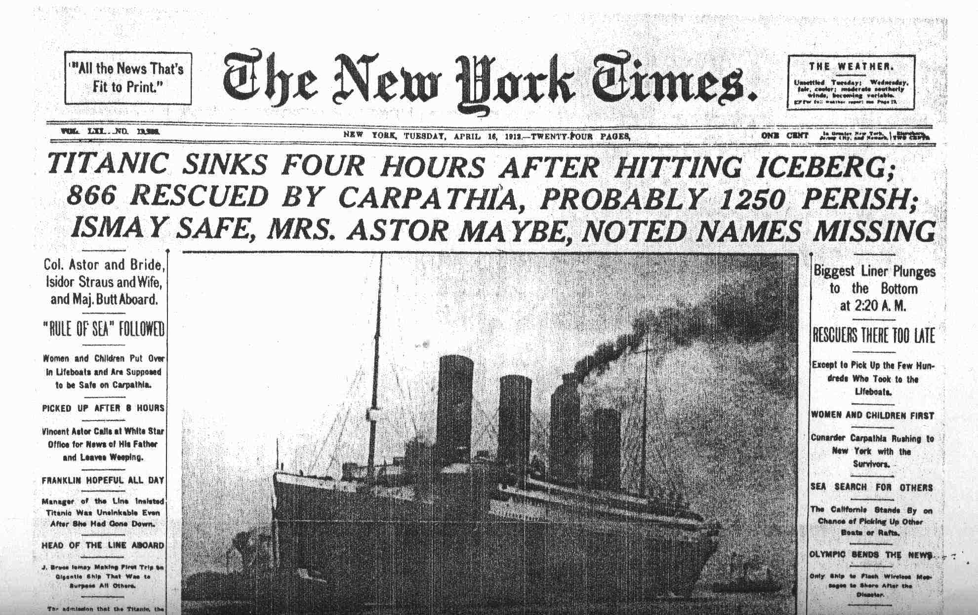 The newspaper covered the Titanic disaster through 75 pages in the initial week. Currently, the leading coverage any event has gotten from the New York Times was the September 11th disaster. Newspapers all over the USA’s eastern seaboard splashed with the news as reports came in from the Carpathia’s wireless operators. On April 16 the New York Times ran with a list of those who had been picked up by the Carpathia and also updated readers on the status of society figures on board – the celebrities of the day. The paper put the initial death toll at about 1,250.