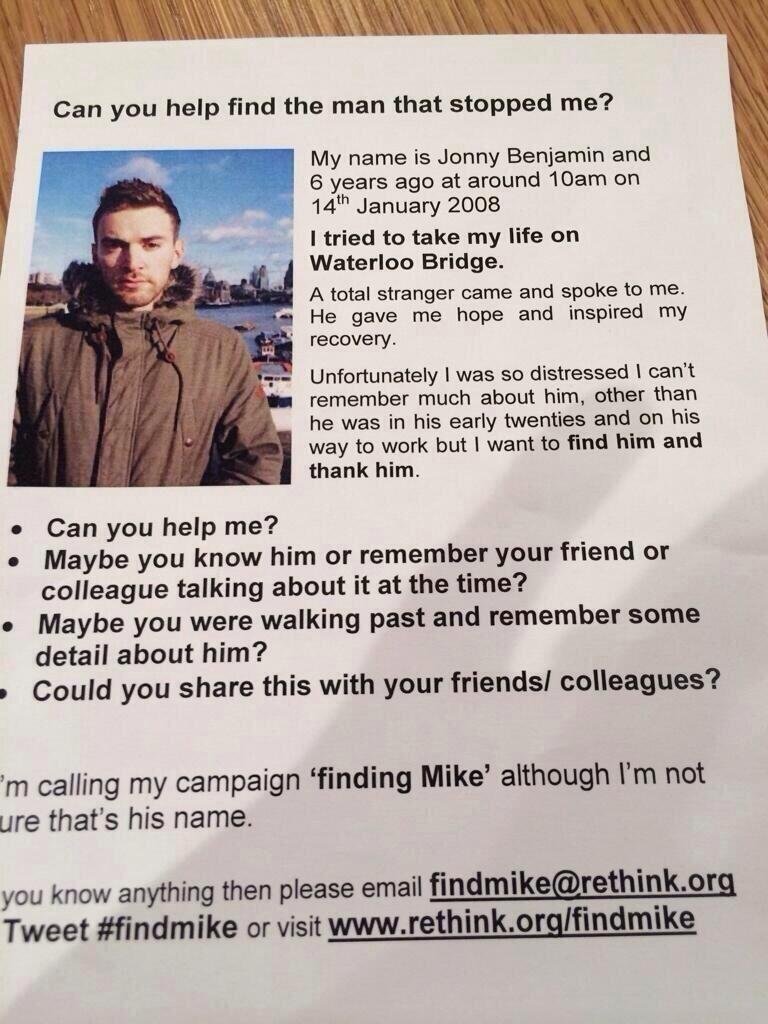 A few months ago, Benjamin, decided to locate the man who was responsible for saving his life. He launched a social media campaign alongside Rethink Mental Illness called #FindMike, using the name Mike as a bookmark for the man whose name he couldn’t recall.