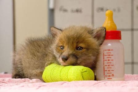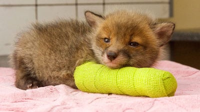 A young red fox was found injured and alone outside a shop in the middle of the busy town center of Leatherhead, Surrey. The abandoned cub weighing just 700g was clearly struggling before a kind passer-by spotted him and contacted a nearby wildlife aid center. The cub had apparently been separated from his mother and had a broken leg. After being contacted, the Wildlife Aid Foundation took the cub into their care. At the center the baby fox’s leg was bandaged as he waited for an orthopedic surgeon to operate on his injured limb. Unfazed by the green bandage on his front right leg, the fox cub quickly used it as a pillow to rest his weary head on.