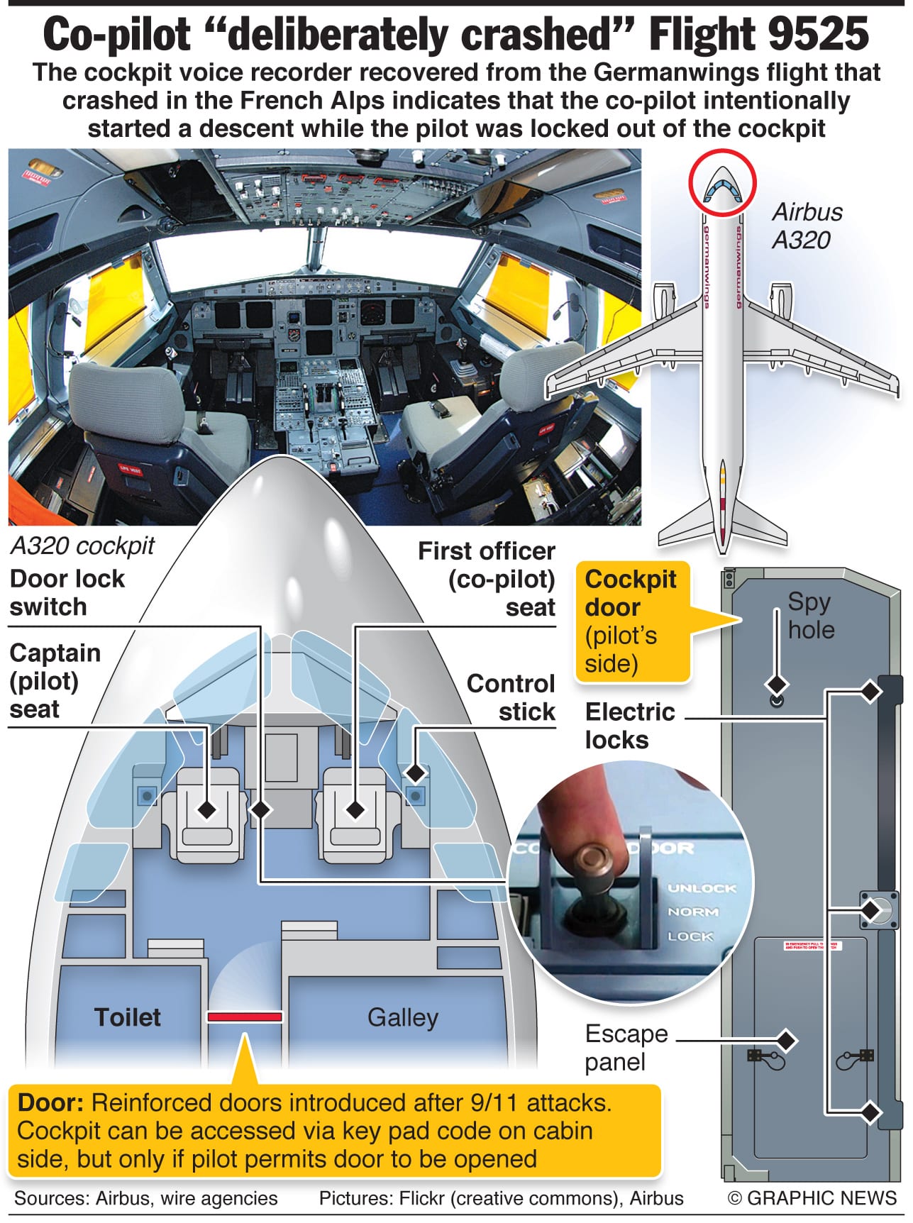 The Airbus A320 plane is designed with safeguards to allow emergency entry to the cockpit if a pilot inside is unresponsive, but the override code known to the crew does not go into effect and goes into a five-minute lockdown if the person inside the cockpit specifically denies entry, according to an Airbus training video and a pilot who spoke to the Associated Press. Airlines in Europe are not required to have two people in the cockpit at all times though it is a requirement in the US.