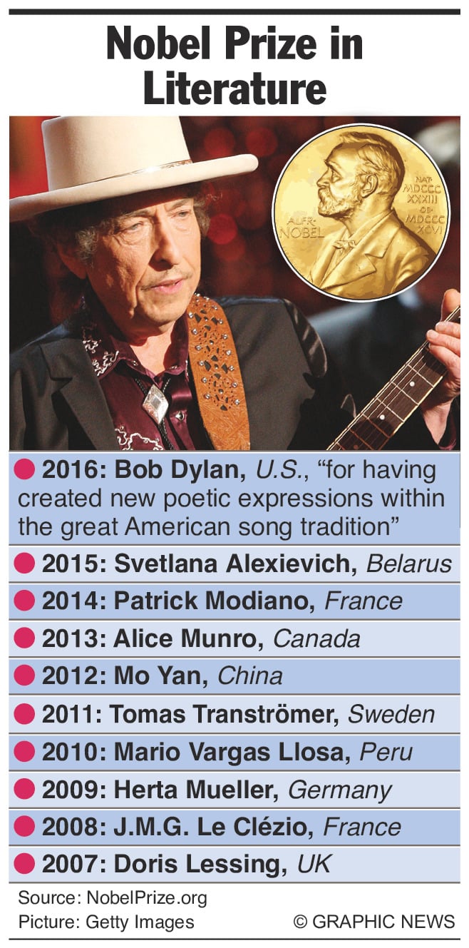 Bob Dylan wins 2016 Nobel Prize in Literature for his song writing