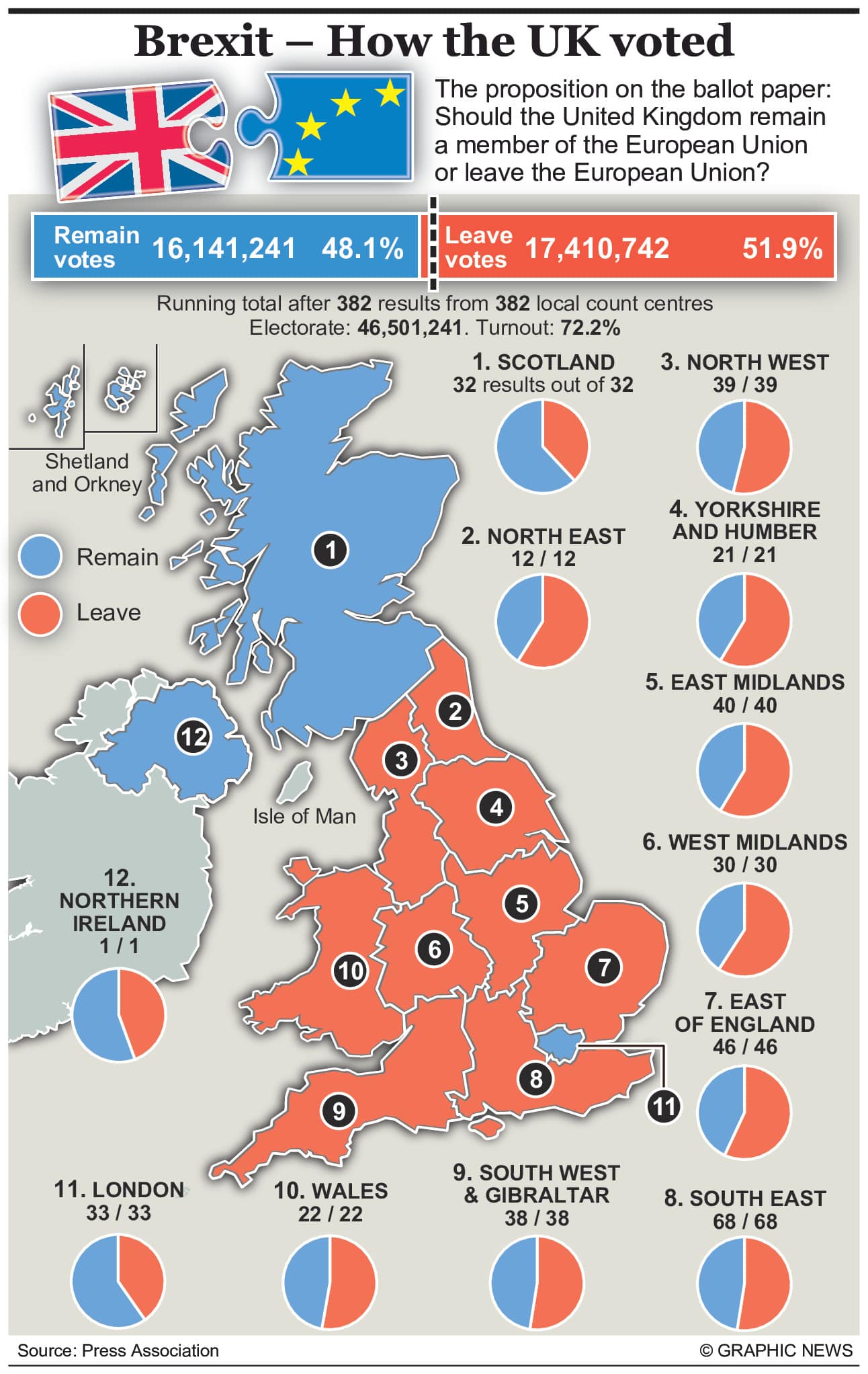 Leave won by 52% to 48% with England and Wales voting strongly for Brexit, while London, Scotland and Northern Ireland backed staying in the EU.