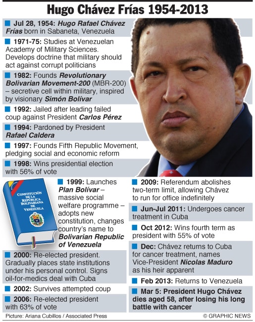 Venezuela’s socialist president Hugo Chavez has died after a two-year battle with cancer, it was revealed last night. The flamboyant leader, 58, had four operations in Cuba, home of his communist pal Fidel Castro. He flew home last month and had not been seen in public since. Nicolas Maduro, the South American country’s vice president, announced the death, saying: “It’s a moment of deep pain.” Dictator Chavez, who ruled for 14 years, outraged Brits by claiming the Falklands should be returned to Argentina. He hated the US and ordered American diplomats out after accusing them of trying to destabilise the country. His death from the cancer — which began in his pelvis — will spark an election. It was announced just hours after Maduro accused Venezuela’s “imperialist enemies” of infecting Chavez.