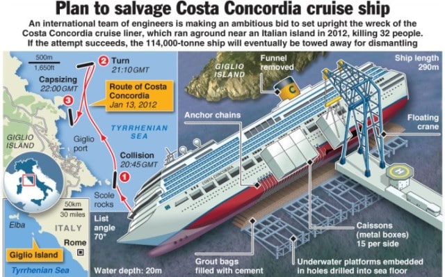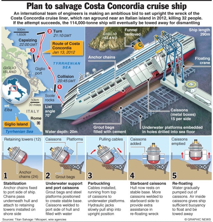 A daring salvage operation has begun to lift the Costa Concordia cruise ship from rocks off the Tuscan coast. Unprecedented efforts by engineers from 26 countries to right the 114,500-tonne vessel continued this evening. The ship has been on its side for more than 20 months, dominating the tiny Italian port of Giglio, off which it ran aground and capsized on January 13 last year with the loss of 32 lives. Two bodies are still missing, and it is hoped they will be found during or after the salvage.