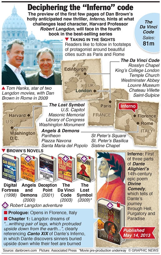 The news generated a considerable buzz on Twitter and quickly became a trending topic, with fans eager to find out the book’s new title. Transworld publisher Bill Scott-Kerr said: "I’ve been working with Dan Brown for over a decade now and every time he delivers a new novel, he never fails to surprise. As a storyteller, he has the great gift of being able to take you on a breathtaking rollercoaster ride at the same time as offering a fresh perspective on what he’s showing us along the way. This brilliant Robert Langdon thriller is no exception – in Inferno he returns to the heart of old Europe and to the territory so compellingly occupied by The Da Vinci Code. It’s another star turn from start to finish." Brown said: "Although I studied Dante’s Inferno as a student, it wasn’t until recently, while researching in Florence, that I came to appreciate the enduring influence of Dante’s work on the modern world. With this new novel, I am excited to take readers on a journey deep into this mysterious realm…a landscape of codes, symbols, and more than a few secret passageways." Brown’s previous novels have been hugely successful.