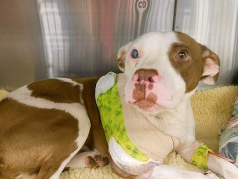 When the brave pit bull arrived at the animal hospital she was in shock and bleeding heavily. Surgical efforts were underway almost immediately, but the leg couldn’t be saved so doctors had to go ahead with an amputation