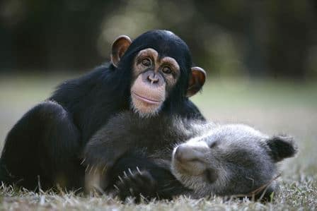 Although Bam Bam is somewhat younger than Vali, they are a perfect match now because, as park owner, Bhagavan Antle explains: “Bears grow incredibly quick and chimps incredibly slow. Recently Bam Bam got to be about the same size as Vali and we could see that they were just about paired up. When the pair was introduced, they hit it off immediately.” About the first meeting, Dr. Antle says: “We got them out there playing on a sunny day and they went on and on for hours. Neither of them wanted to quit. They would both lie down and fall asleep at our feet, wake back up and start wrestling again.”