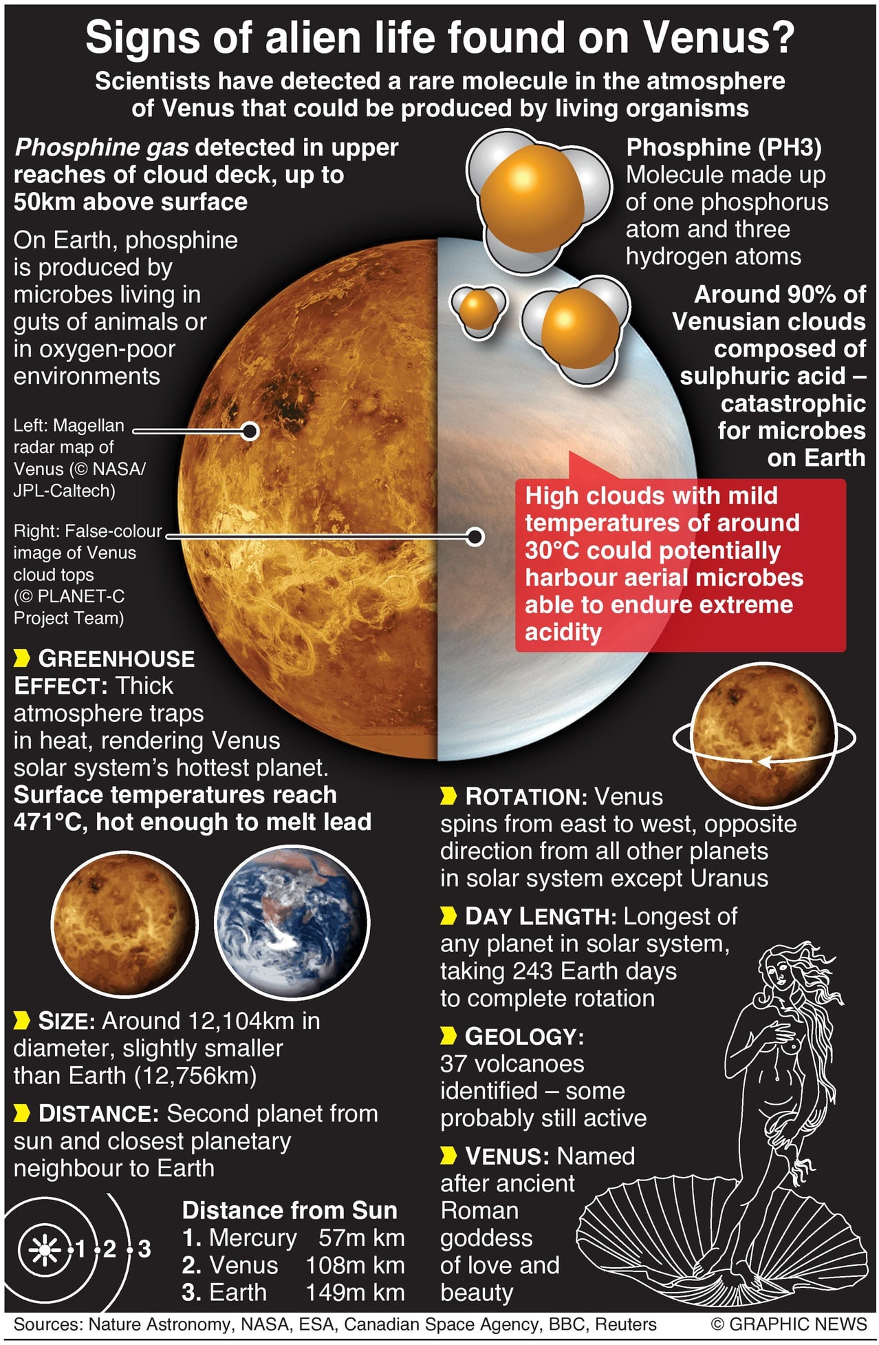 Two telescopes in Hawaii and Chile spotted the highly intriguing presence of the chemical phosphine near the top of the acidic clouds that blanket the planet.