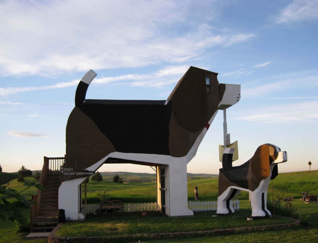 The couple are definitely dog-lovers themselves: they have been carving and selling wooden dogs for two decades, recreating over 60 breeds and poses of dogs. While it seems to be quite a feat to carve small folk-art style statues with a chainsaw, Dennis and Frances manage very well with dogs as small as 12.5 cm tall. Their most famous creations, however, are the two giant beagles. They were inspired by the roadside architecture popular in the early days of automobile vacation travel when travellers would often buy petrol, eat meals or stay overnight in a building that didn’t look like a building at all: the coffee pot or teacup gas stations, milk bottle shaped restaurants and the shoe and duck houses were joined by two canines.