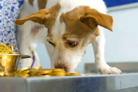 A greedy dog had to be saved by vets after it ate a whole bag of harmful chocolate coins.