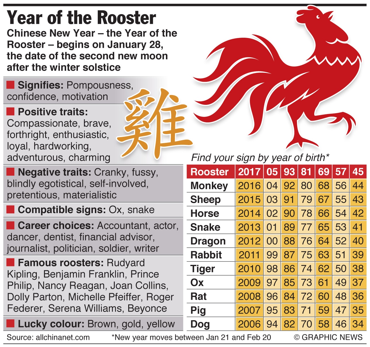 Roosters are the tenth sign in the zodiac and are seen as confident, honest and hardworking. They also enjoy being around people but can be seen as attention seekers.