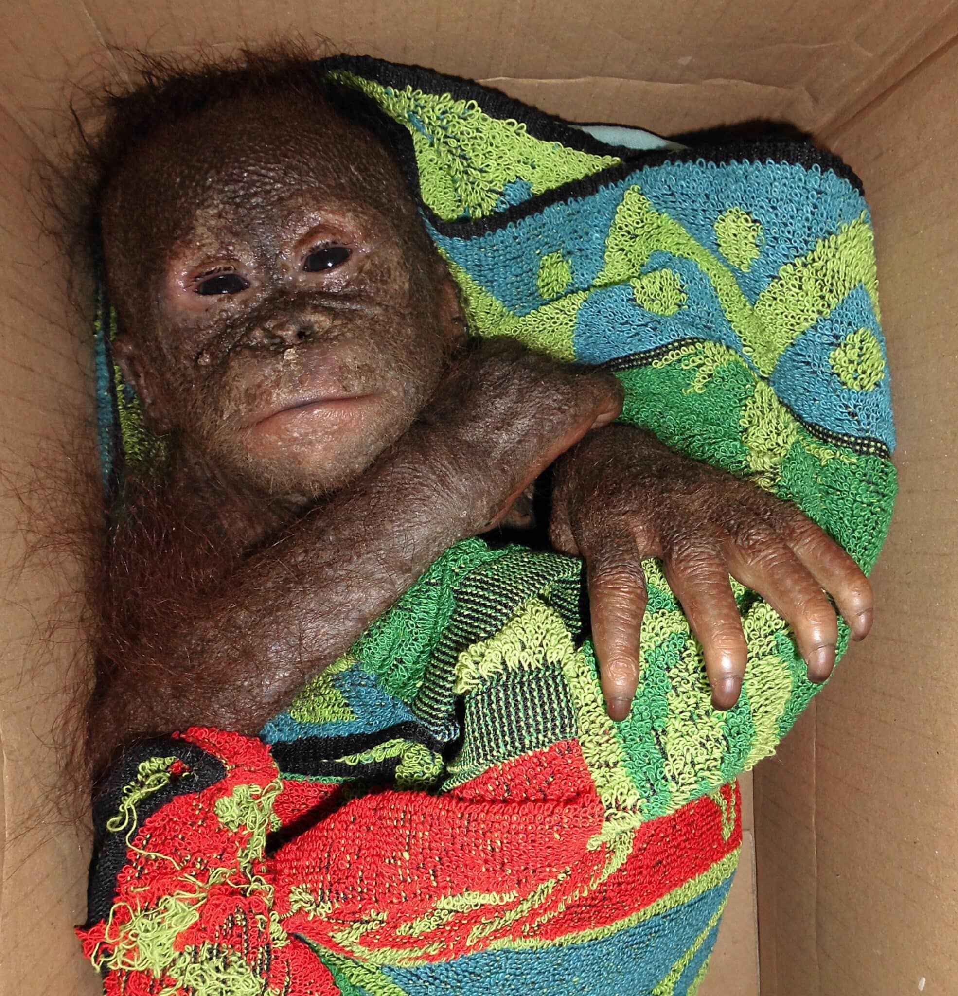 The group that saved him, International Animal Rescue, said he was so lifeless when they reached him that, at first, they thought he was dead. “He was lying corpse-like with his arms folded across his chest and this, along with a lack of hair and gray flaking skin, made him look almost mummified in his cardboard coffin,” said Alan Knight, CEO of the charity which runs an orangutan sanctuary in Borneo.