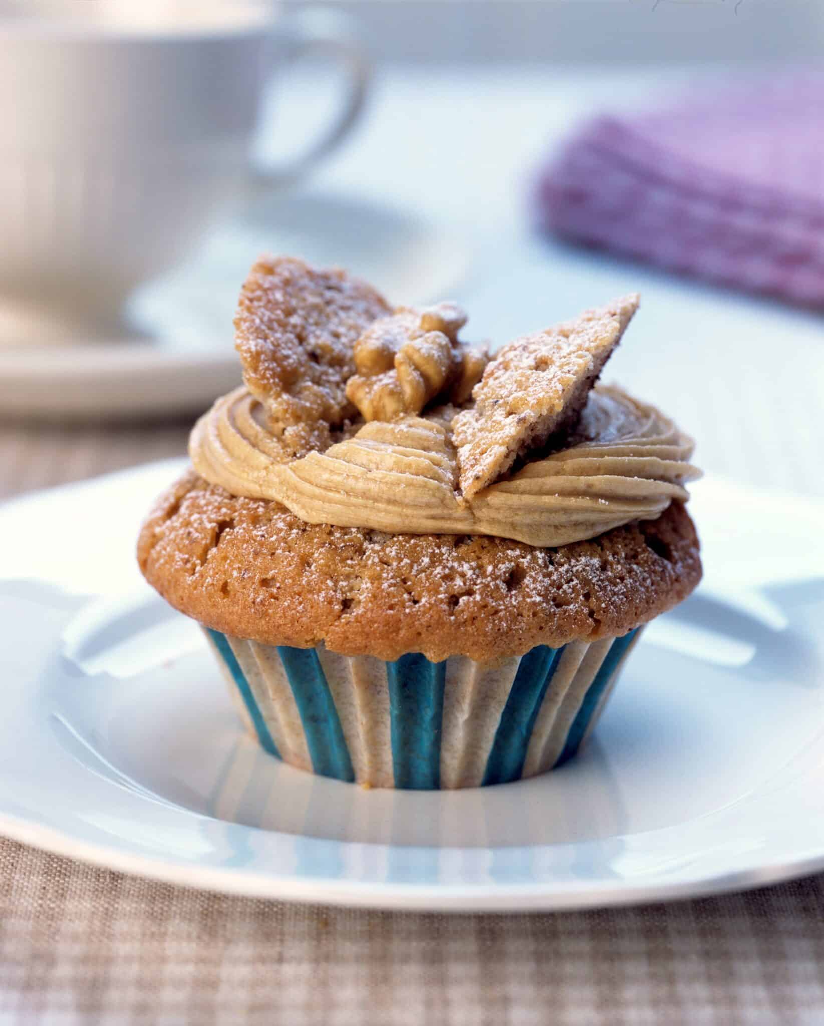 5. Cut off the tops of the cakes and cut each top in half. Pipe a swirl of icing on each cake and replace the two top halves to resemble ‘wings’. Place a piece of walnut in the centre to complete the ‘butterfly’. Dust with icing sugar.