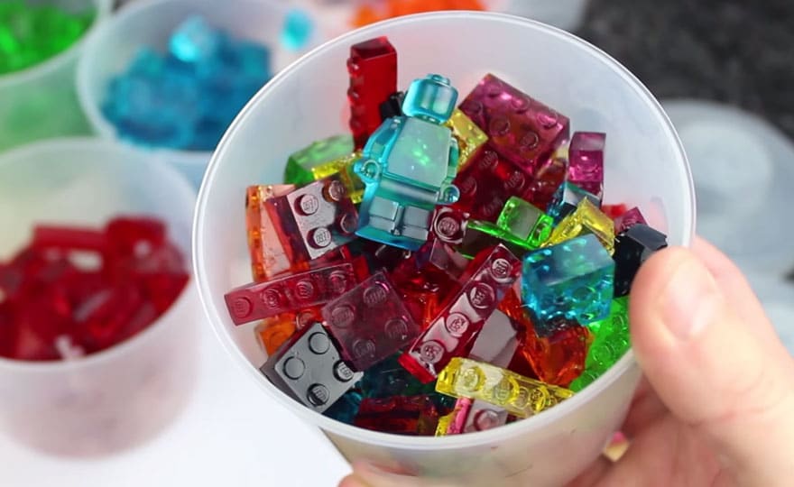 All you need is gelatin/Jell-O, water, and corn syrup and a silicone LEGO mold, which you can buy or make.