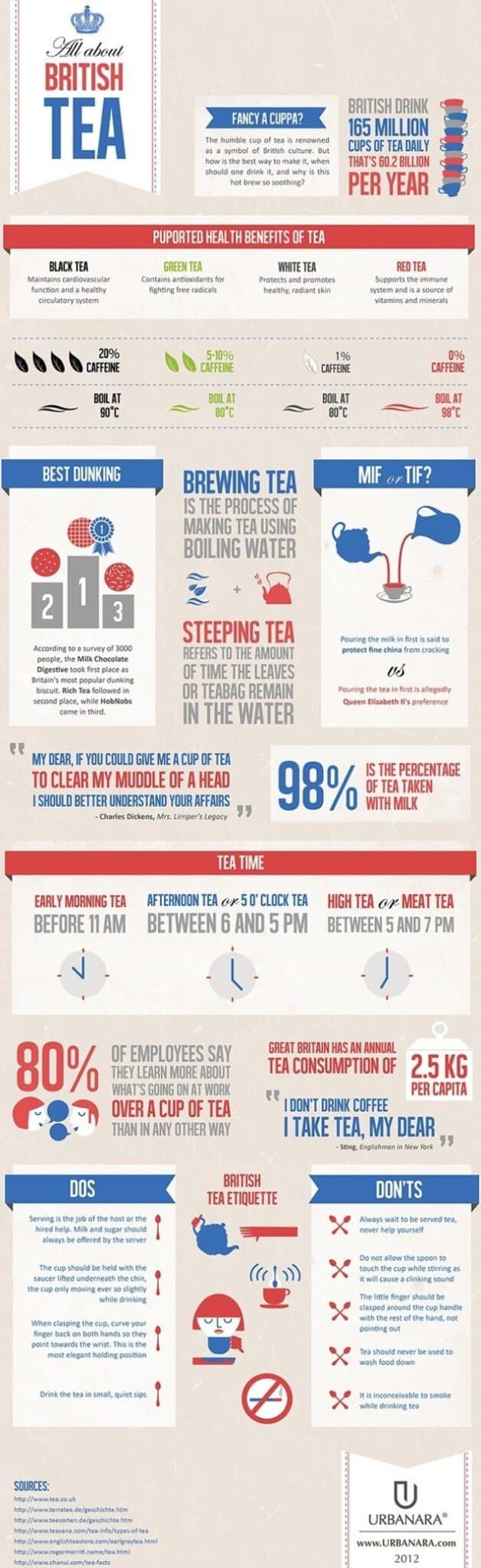 Drinking tea has become a culture of British. Around 165 million Britishers drink tea daily. Based on flavor and taste, Tea can be classified into four different types, such as Black tea, Green Tea, White Tea, Red Tea. Black tea contains 20% of caffeine and is boiled at 90 degrees. 5-10% of caffeine can be found in Green tea. While white tea has 1% of caffeine, Red tea contains 0% caffeine. Brewing and steeping tea are two familiar methods of making tea. 98% of tea is taken with milk. Most people take tea before 11am or 6am -5pm, and between 5pm to 7pm.