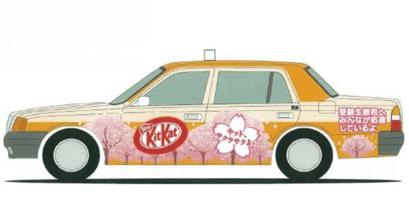 Now, with the January to March exam season almost upon us, Nestlé Japan has teamed up with the Nishitetsu taxi company in Fukuoka Prefecture, Kyushu, to provide a lucky cab service for locals in the area. Called the “Juken ni KitKat” model, or the “Sure to Succeed in the Exam” model, the eye-catching cars will come in two varieties.