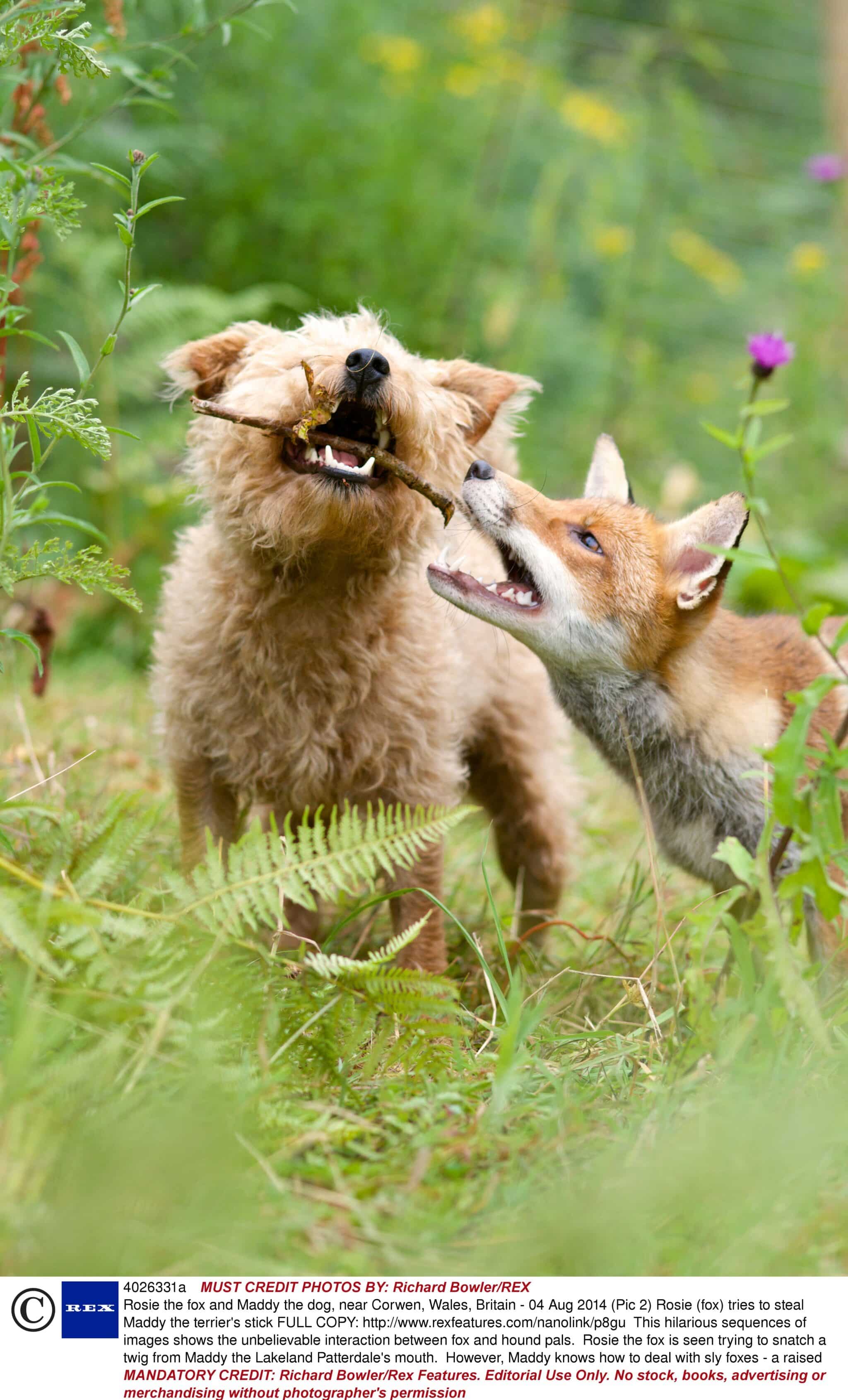 This hilarious sequences of images shows the unbelievable interaction between fox and hound pals. Rosie the fox is seen trying to snatch a twig from Maddy the Lakeland Patterdale’s mouth. However, Maddy knows how to deal with sly foxes – a raised paw is the perfect method to block a stick snatcher.