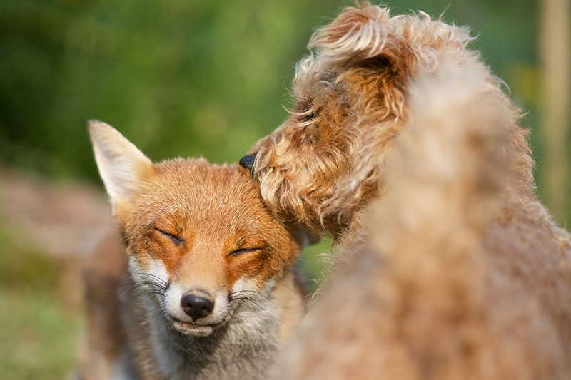 He explains: “Throwing the stick is Maddy’s favourite game, Rosie loves to steal ot off of her. They love chasing each other; usually Maddy does the chasing but if Rosie feels she’s not getting enough attention she’ll dive on Maddy to get the game started. Both are very vocal with each other but it never turns nasty. Even though Maddy to a terrier she’s never been a snappy dog. When Rosie has had enough she goes and lays down under the bracken in her enclosure. If Maddy’s had enough she goes and sits by the gate to get let out. They interact about 3-4 times a day. Sometimes if neither of them are in the mood to play they just greet each other by sniffing each other and then just chill out in the sun, it’s not always manic when they are together. Maddy has always been a playful pet and it is a natural instinct for a fax cub to play so it is no surprise they share the same instinct for fun.”