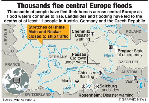 Officials across central Europe issued disaster warnings and scrambled to reinforce flood defences today as rivers swelled by days of heavy rain threatened to burst their banks. At least five people have died and nine are missing due to floods in Germany, Austria, Switzerland and the Czech Republic in recent days. The Danube in the southeast German city of Passau is expected to rise to its highest level in 70 years today and a spokesman for the city’s crisis centre said the situation has become ‘extremely dramatic’. In Prague, almost 2,700 people have been evacuated from low-lying areas as the country sees its worst flooding in a decade. Czech police said at least five people had died in the flooding. Firefighters evacuated homes in western regions and in villages outside the capital today and yesterday, rescuing 200 people. Czech officials said the waters of the Vltava river could reach critical levels in Prague and that special metal walls were being erected to prevent flooding. Interim Mayor Tomas Hudecek said they were shutting down eight stations of the capital’s subway network and urging people not to travel to the city. Flooding was also reported in Austria and water levels rose in Germany and Poland after heavy rain in central Europe over the past week swelled rivers. The subway network in central Prague was halted due to the weather. It is the first time it has been closed since massive floods submerged the city in 2002 and caused billions of dollars of damage in the Czech Republic. Czech Prime Minister Petr Necas declared a state of emergency for most of the nation on Sunday and pledged 300 million crowns ($15.11million) for relief efforts. Troops started putting anti-flood barriers in place in Prague and volunteers helped pile up sandbags in areas popular with tourists in the ancient centre. The landmark Charles Bridge was closed and workers evacuated parts of Prague zoo. Levels on the Vltava river that cuts through Prague’s centre continued to rise. In Germany, where at least four people have died or are missing, Chancellor Angela Merkel promised federal support for affected areas and said the army would be deployed if necessary. The water level had risen by at least five meters in Munich. Several cities including Chemnitz in the east of Germany, and Passau and Rosenheim in the south, issued disaster warnings. Passau, which is located at the confluence of three rivers, could see waters rise above record levels of 2002, said Mayor Juergen Dupper. German news agency dpa reported that large stretches of the Rhine, Main and Neckar rivers have been closed to ship traffic. Evacuations are also taking place in neighbouring Austria and Switzerland. Rivers also were spilling over their banks in some rural areas of south-western Poland, and people have been evacuated.  Meteorologists are predicting the rainfall will ease in the coming days.