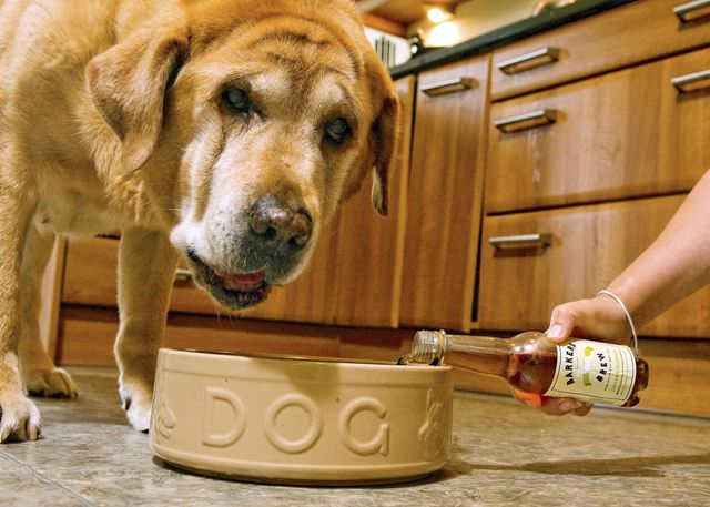 This thirsty golden Labrador enjoys a little hair of the dog – by downing a new beer designed for pets. The meat-flavoured “beer” for dogs, called Barkers Brew, is now available in two flavours, chicken and beef. It is non-alcoholic and non-carbonated and contains vitamin E, which even supports the dog’s immune system. It costs £2.50 a bottle and the liquid can be added to water as well as poured over dried food to give a dog’s dinner a new flavour.