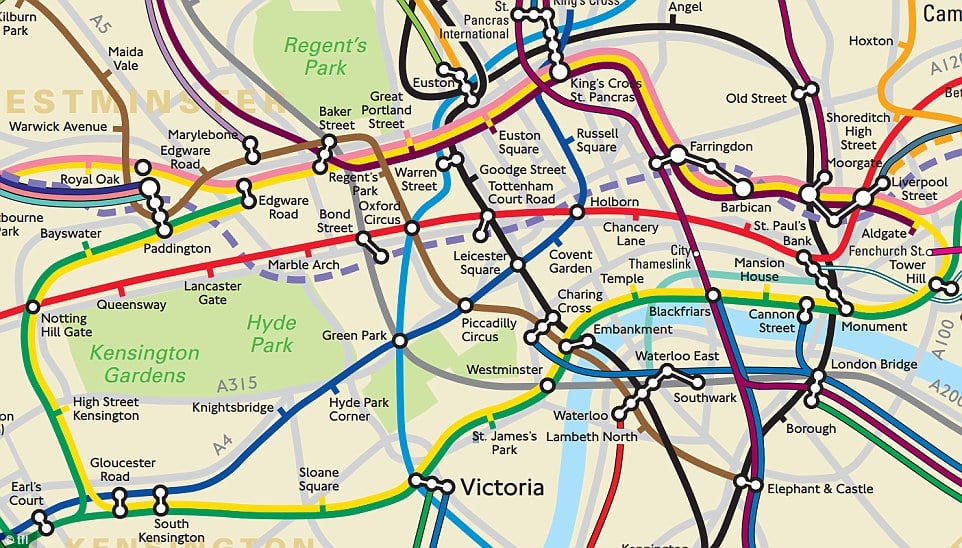 But a map has now surfaced showing the geographic accuracy of the Underground network – and the real distance between stations. As well as showing the tube network – which has been growing since 1863 when the Metropolitan line opened – the map shows the National Rail routes and the planned Crossrail line, snaking through the city. The map was designed for engineering works planning rather than customer use but is now being added to TfL’s website due to its apparent popularity.