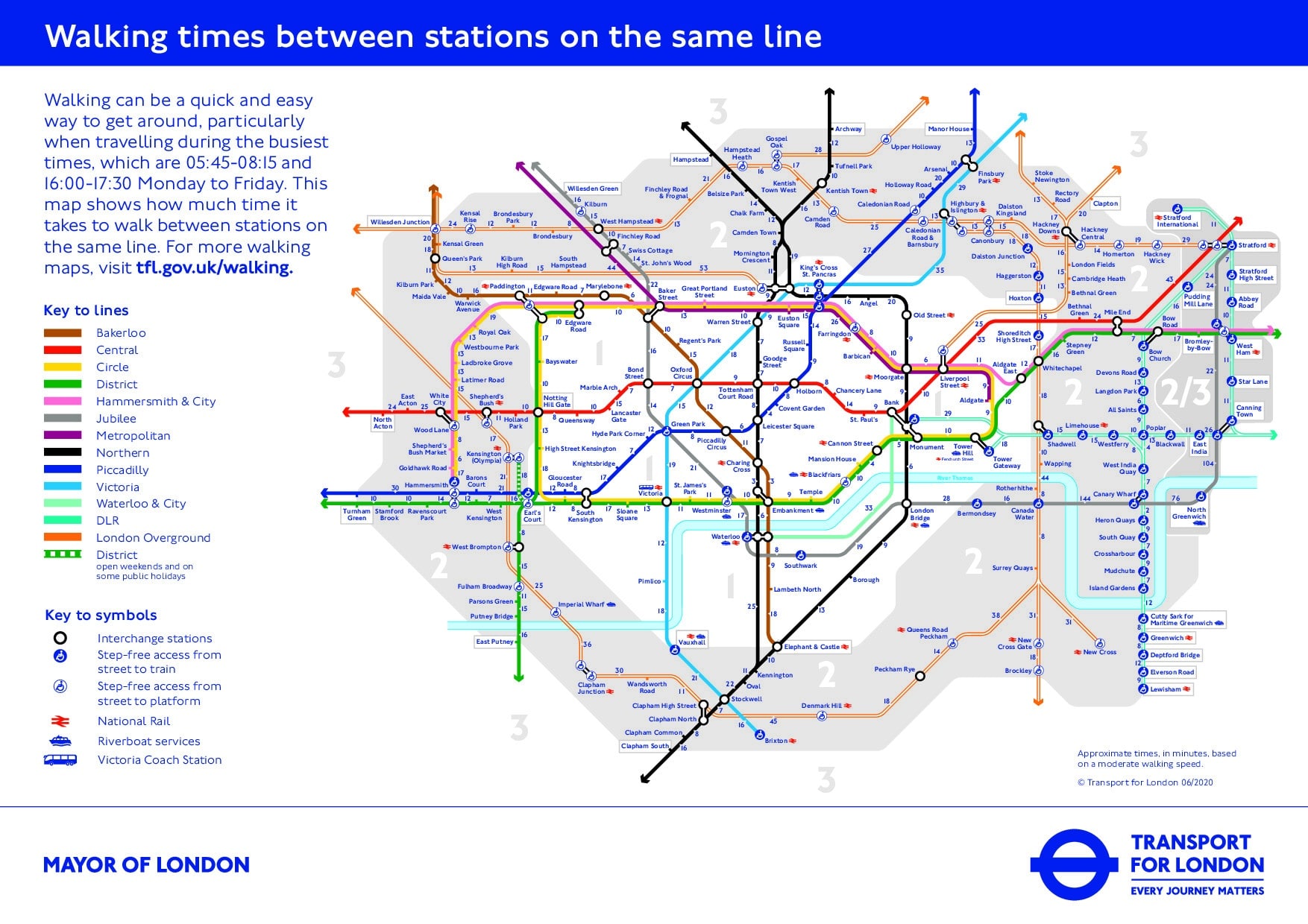 ‘This map shows how much time it takes to walk between stations on the same line.’ The diagram actually reveals that most stations in central London are less than 10 minutes away from each other.