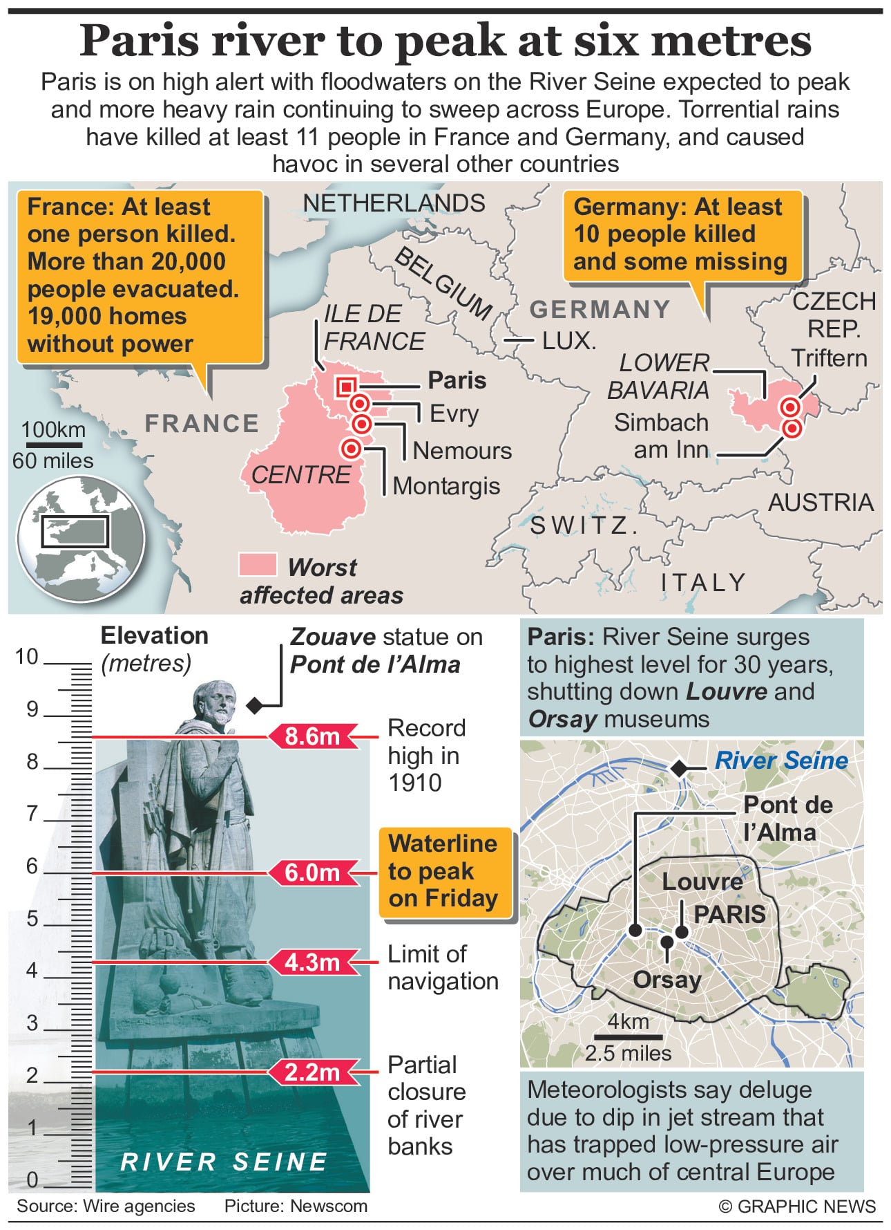 In Paris, the Cluny – La Sorbonne and St Michel metro stations were closed as a precaution while the river spilled onto the city’s streets.